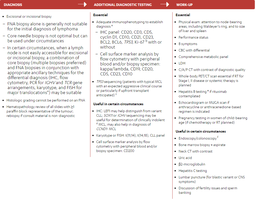 FNA=fine needle aspiration; IHC=immunohistochemistry; PCR=polymerase chain reaction; IGHV=immunoglobin heavy chain variable; TCR=T-cell receptor; FISH=fluorescent in situ hybridization; LEF1=lymphoid enhancer-binding factor 1; CLL=chronic lymphocytic leukemia; CCND1=cyclin D1; CBC=complete blood count; LDH=lactate dehydrogenase; C/A/P=chest/abdominal/pelvic; CT=computerized tomography; PET=positron emission tomography; RT=radiotherapy; MUGA=multigated acquisition; CNS=central nervous system.